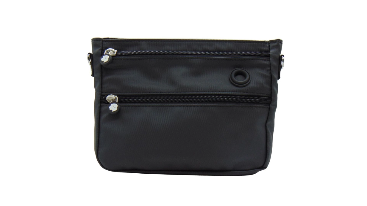 På framsidan finns en praktisk mobilficka och på baksidan två fickor för avfallspåsar. Magnetlåset gör det enkelt att snabbt komma åt innehållet.